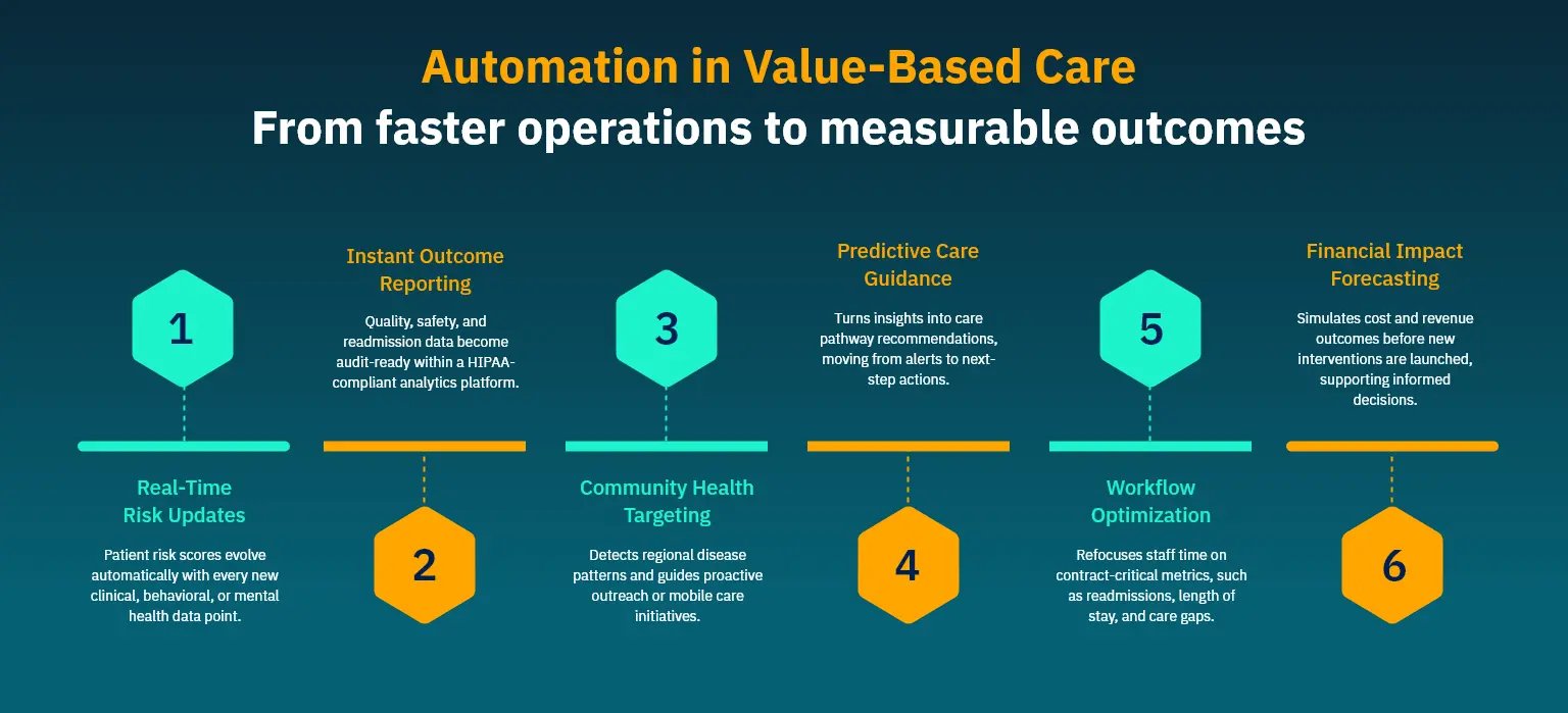 Automation tied to healthcare business intelligence is rewriting how organizations perform in value-based contracts. The following are the potential areas of implementation: