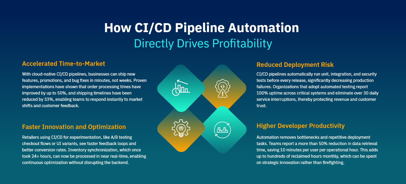 - Faster Innovation and Optimization: Retailers using CI/CD for experimentation, like A/B testing checkout flows or UI variants, see faster feedback loops and better conversion rates. Inventory synchronization, which once took 24+ hours, can now be processed in near real-time, enabling continuous optimization without disrupting the backend.