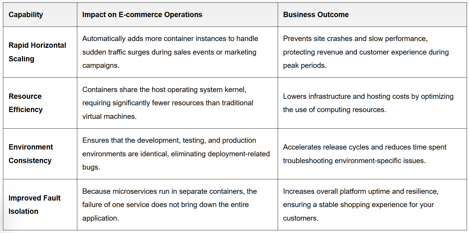 Packaging applications and their dependencies into lightweight containers eliminates environment-specific bugs that often derail deployments. The result is reduced downtime, smoother rollouts, and higher platform reliability, all of which directly protect revenue and reduce customer frustration.