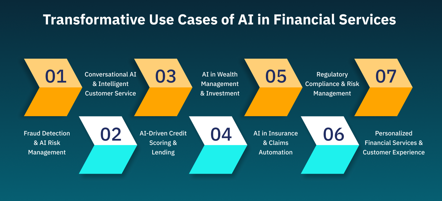 - High-impact applications include fraud detection AI, conversational AI for banks, AI-powered credit scoring, AI risk management, and hyper-personalized financial services