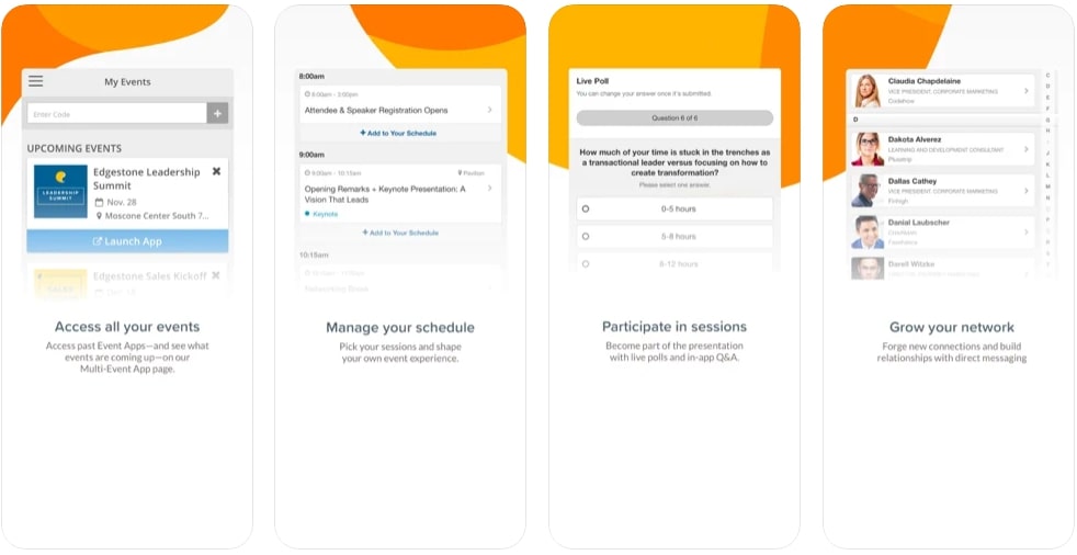 It is an event app mainly used for organizing various types of conferences, trade shows, or meetings. This app offers organizers a better understanding of their attendees as it delivers a complete report about the attendee’s behavior on the app and measures parameters like app usage time, session attendance, and connections made. With Aventri, an event organizer can send notifications to attendees as per their preferences or location easily.